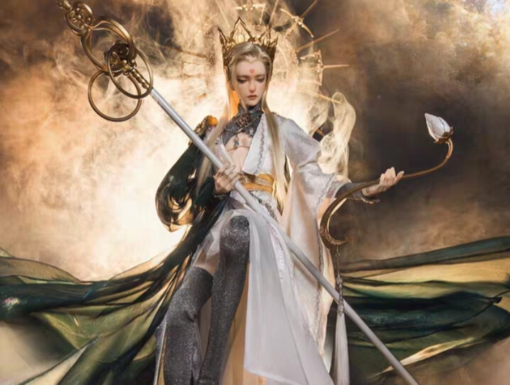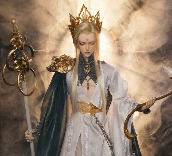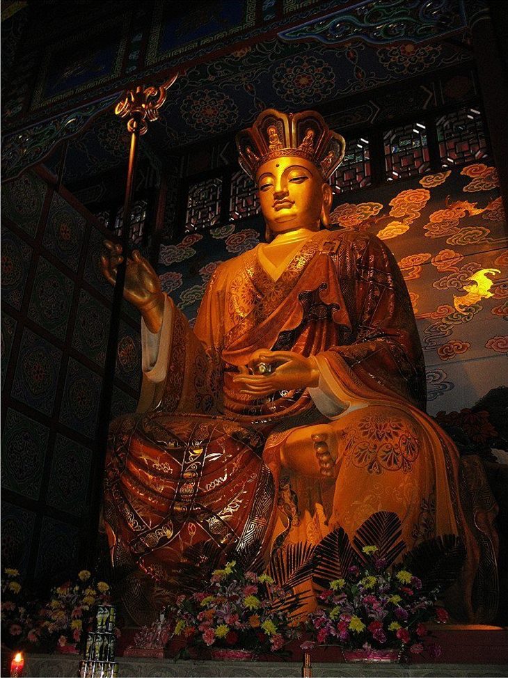 民间相传,地藏菩萨的座骑,是能够分辨善恶贤愚的神兽谛听。其常被供奉于地藏菩萨的案侧,或直接雕刻地藏菩萨端坐于其背上的塑像。早期的地藏形象是在家菩萨装束,相貌如天人,装扮华丽,慈祥庄严(可见于敦煌、龙门石窟),为在家相,通常头戴宝冠,著在家居士服饰,庄严璎珞。